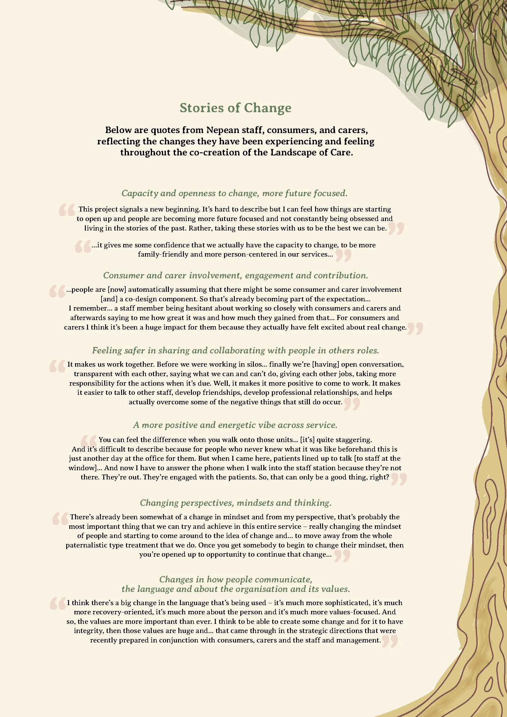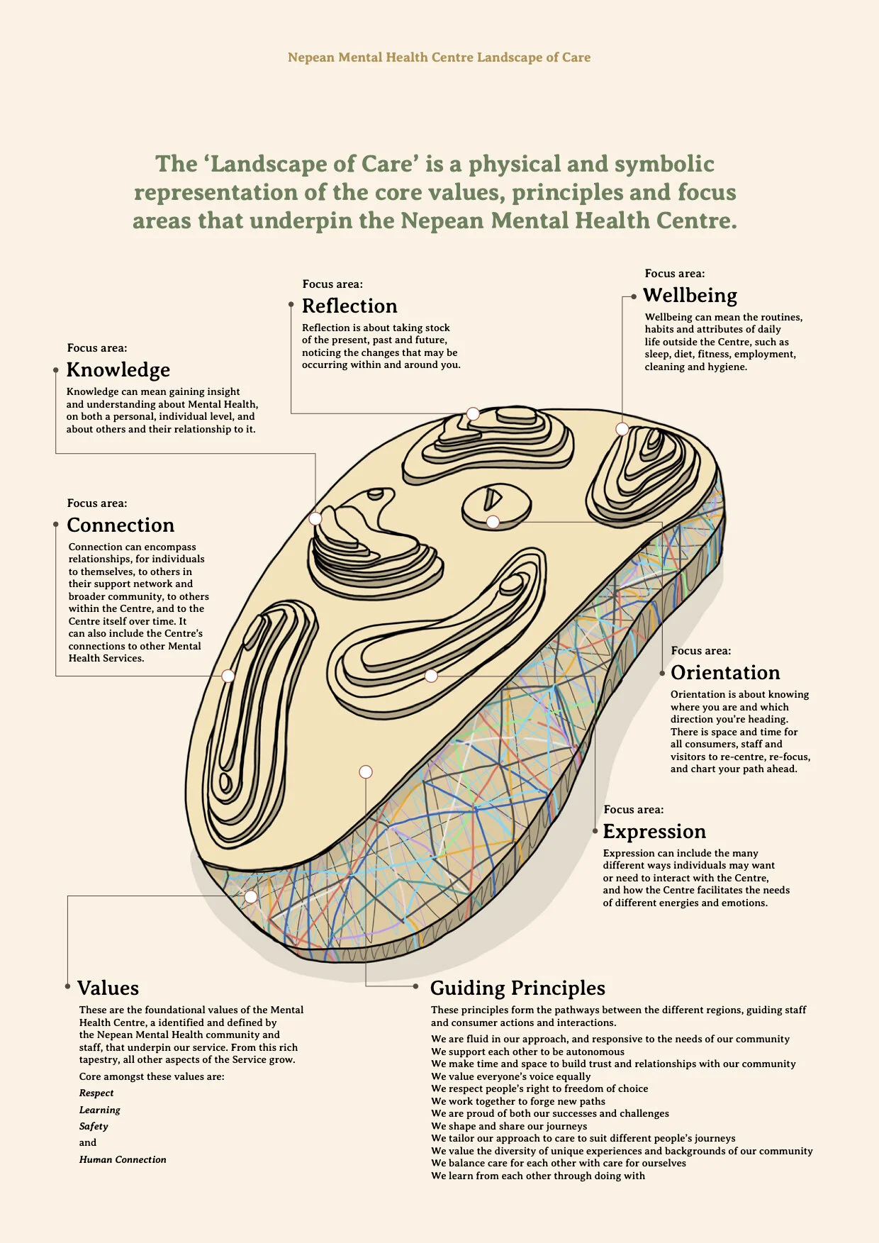 We worked with all stakeholders across the Nepean Mental Health ecosystem to understand what person-centric care looks like to them. The ‘Landscape of Care’ provides the basis for a more individualised, non-linear approach to the delivery of the service, for consumers, carers and staff alike.