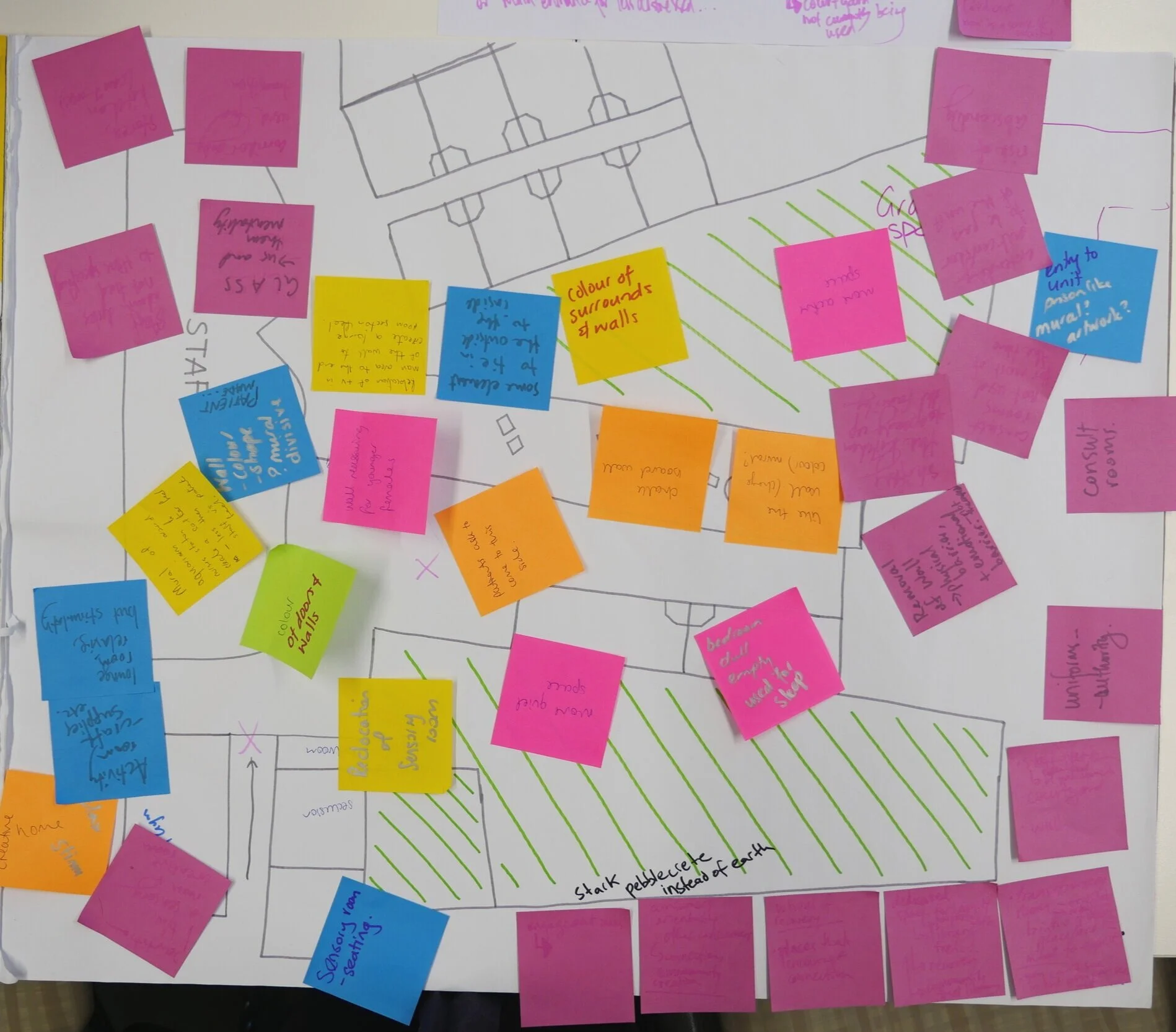 We held workshops with a range of Nepean stakeholders to get their perspectives on how to reduce the need for seclusion through space and environment redesign. This included new courtyards and therapeutic rooms.