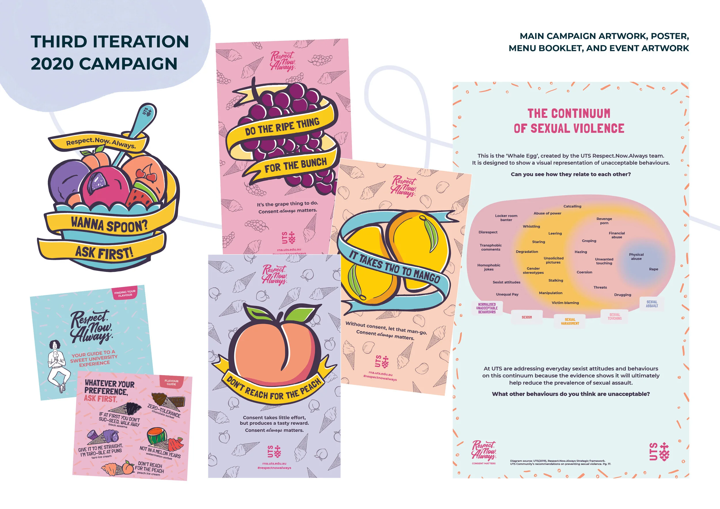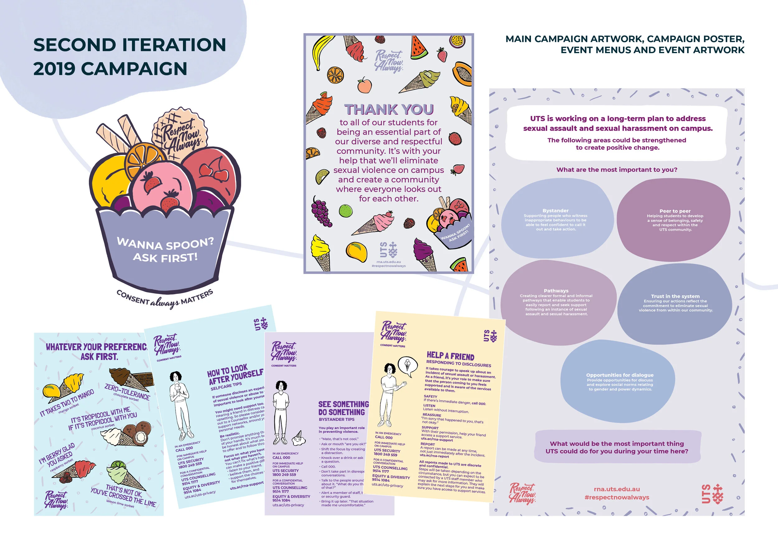 Historically, strategies for eliminating sexual violence have focused on deterrence through punishing offenders, and punitive warnings around the consequences of offending. These approaches breed fear, can alienate and confuse people, and paradoxically do little to deter individual instances of offending. The light-hearted "Wanna Spoon? Ask First!" ice-cream themed campaign branding challenges these approaches, giving participants the opportunity to reflect, talk and be listened to, and encouraging nuanced discussion of a topic that often confuses, upsets and silences people. The bright visual communication represents a clear departure from the norm of grim, confronting text and imagery focused on illegal behaviour.