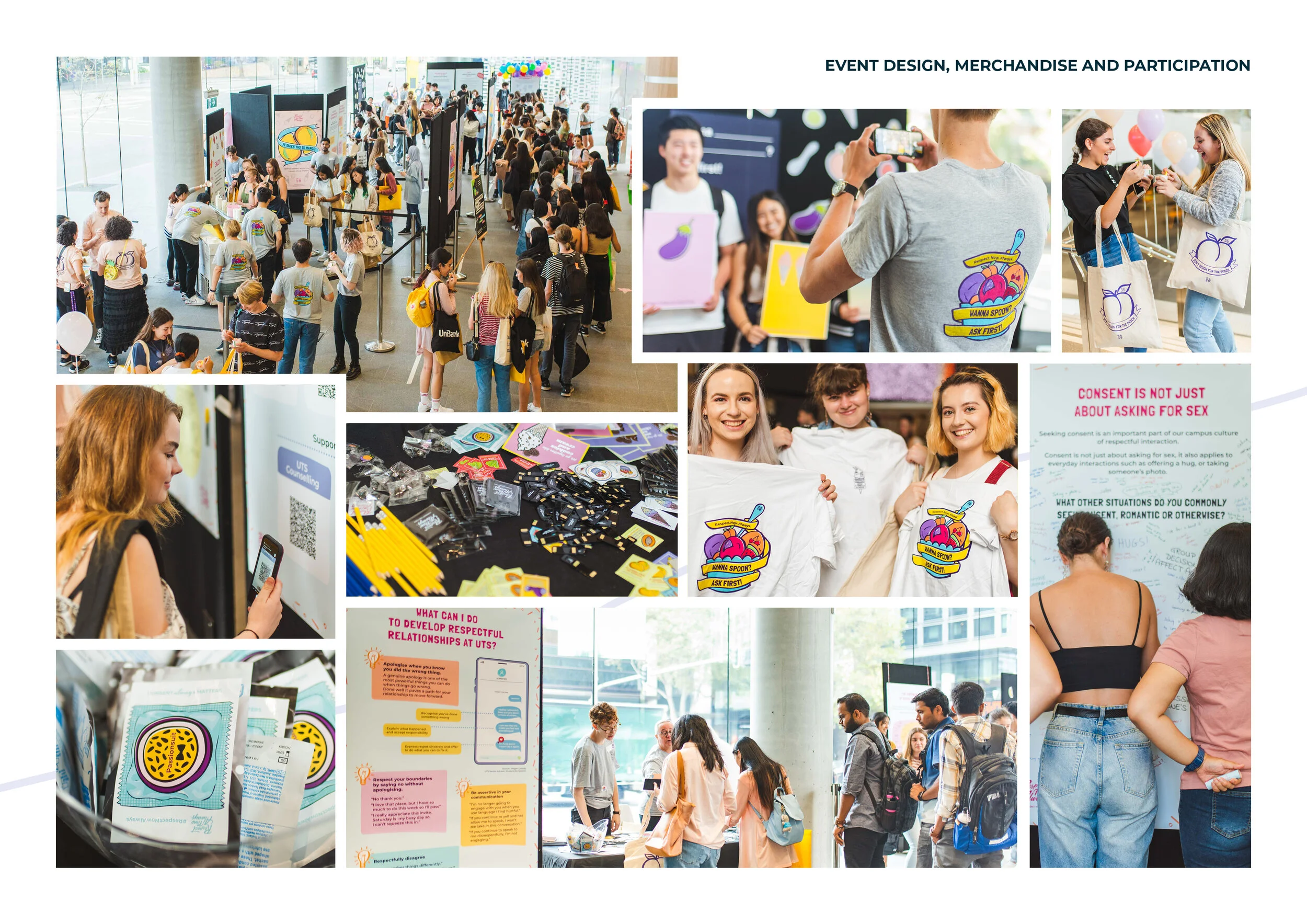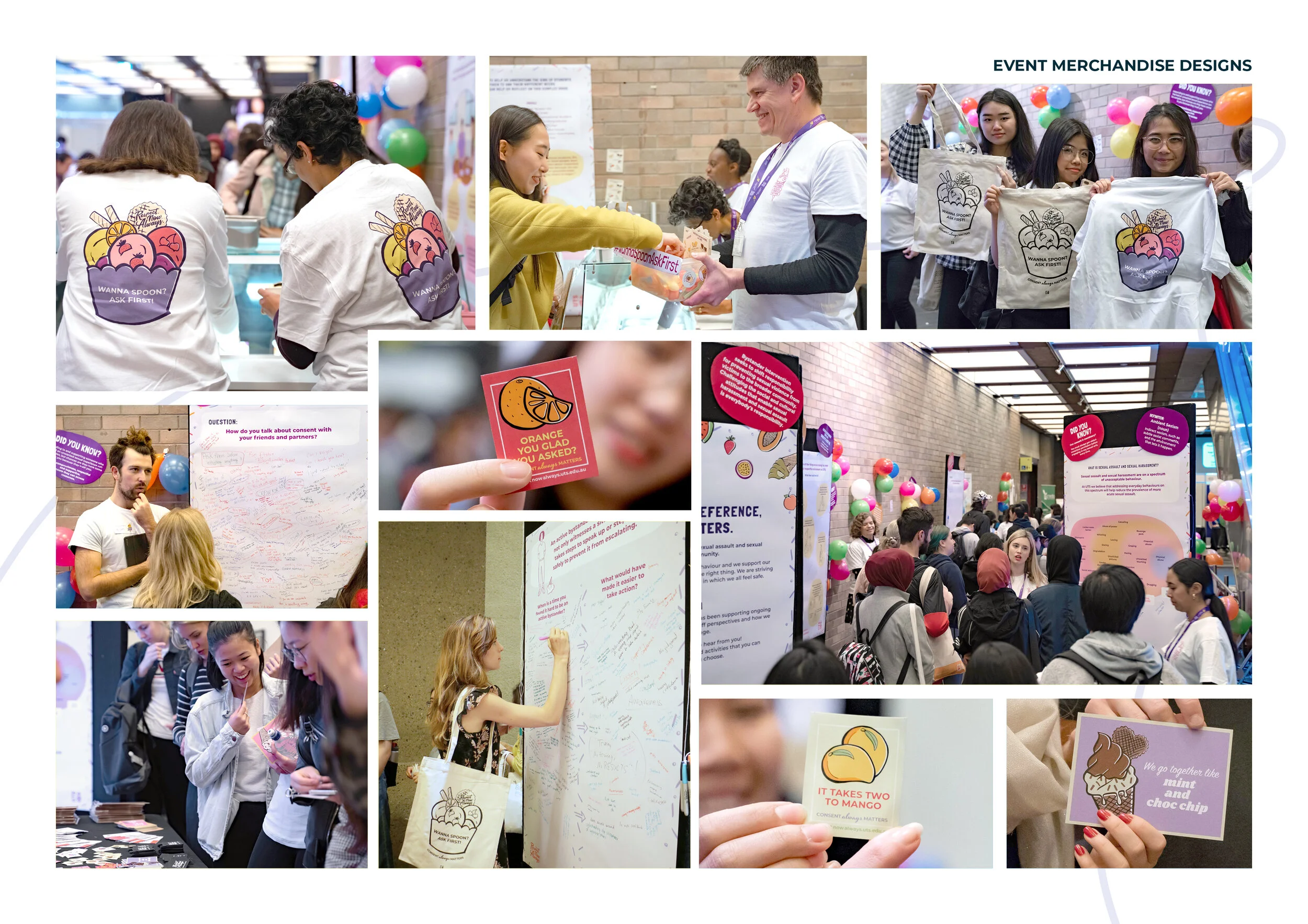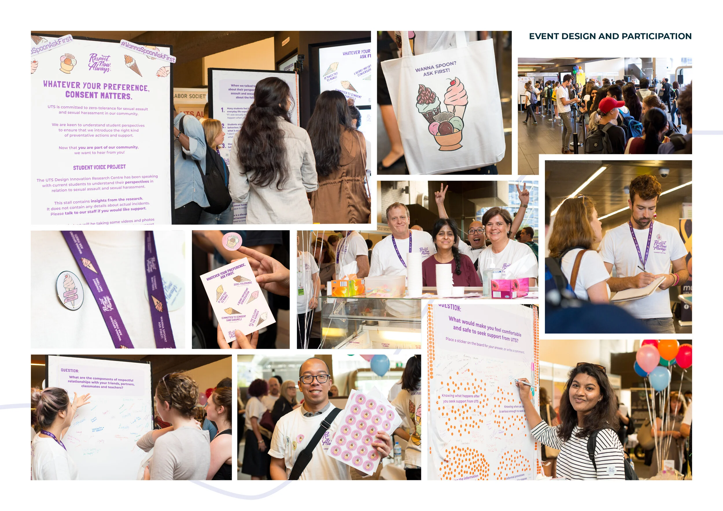 The activation spaces are curated so participants experience highly accessible education through conversations, questions, interactive games and activities, guided by staff and student volunteers. While building sexual violence literacy and intervention skills, these activities have also provided research data on community perceptions. Topics addressed have included attitudes that underpin sexual violence, bystander intervention and support services, through interactive modes such as sticker voting, poster writing, photo booths, competitions and dialogue. Free ice-cream is served, with flavours re-named with consent-related puns developed with students in social media competitions. Merchandise (including t-shirts, condoms and stickers) enable participants to publicly declare their support of consent and respect.